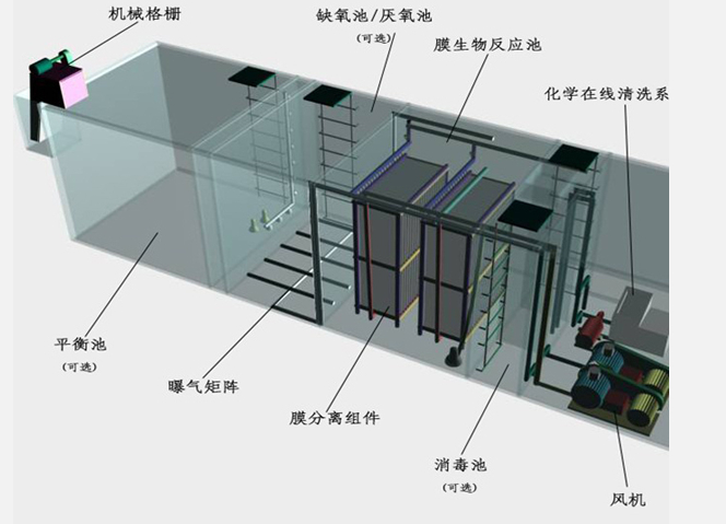 MBR一體化設(shè)備利用膜生物反應(yīng)器(MBR)進(jìn)行污水處理及回用的一體化設(shè)備。其具有膜生物反應(yīng)器的所有優(yōu)點(diǎn):出水水質(zhì)好,運(yùn)行成本低、系統(tǒng)抗沖擊性強(qiáng)、污泥量少,自動(dòng)化程度高等,另外,作為一體化設(shè)備,其具有占地面積小,便于集成。它既可以作為小型的污水回用設(shè)備,又可以作為較大型污水處理廠(站)的核心處理單元,是目前污水處理領(lǐng)域研究的熱點(diǎn),具有廣闊的應(yīng)用前景。